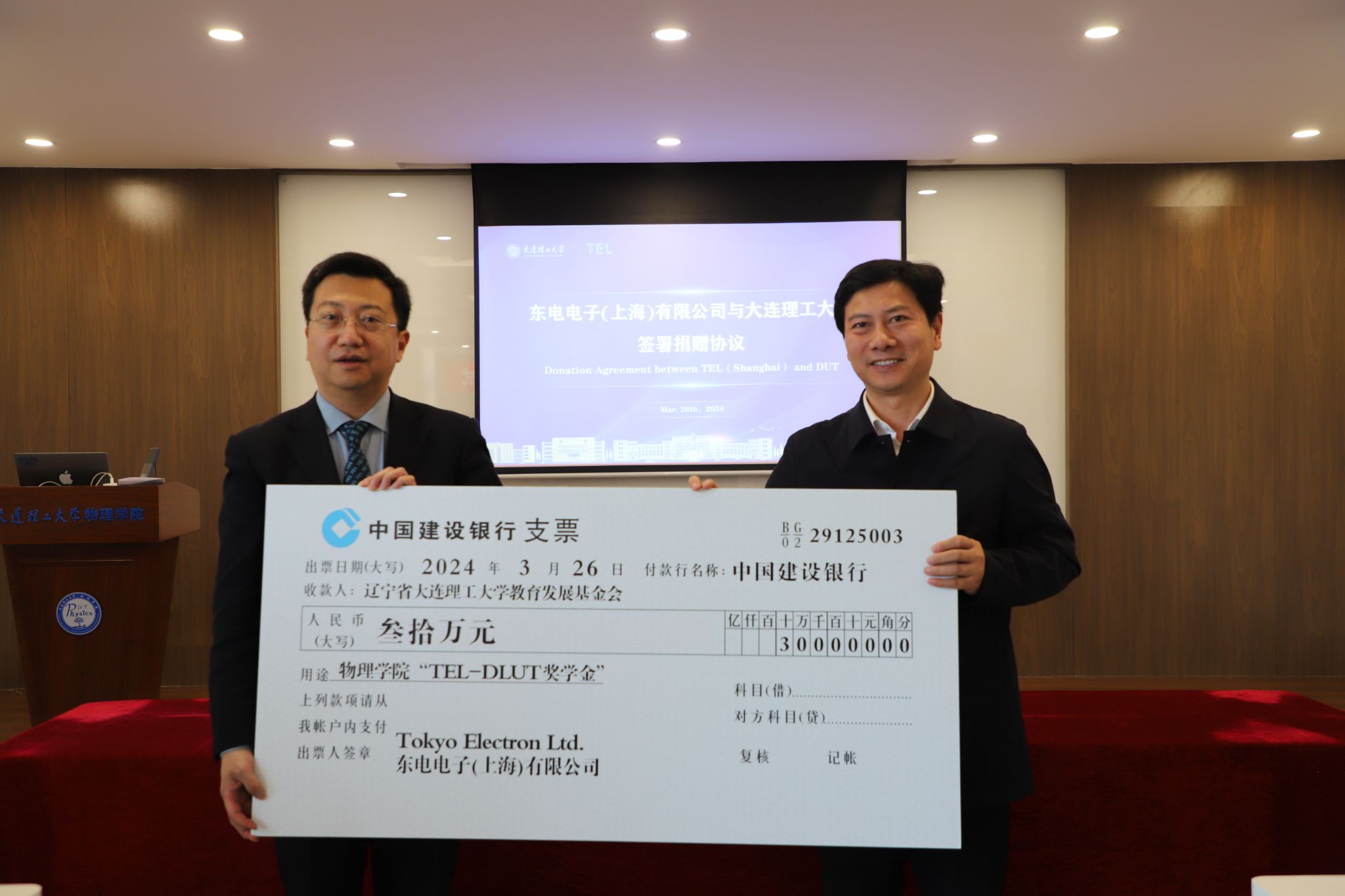 3月26日上午,大连理工大学物理学院“TEL-DLUT奖学金”捐赠签约暨颁奖仪式隆重举行。Tokyo Electron Ltd.(以下简称TEL集团)向大连理工大学物理学院捐资设立“TEL-DLUT奖学金”,用于支持等离子体物理学科人才培养。学校党委常委、副校长朱方伟、东电电子(上海)有限公司总监钱立群等出席仪式,TEL集团项目总监Yuji Tsukamoto等高管在TEL日本总部线上参会。