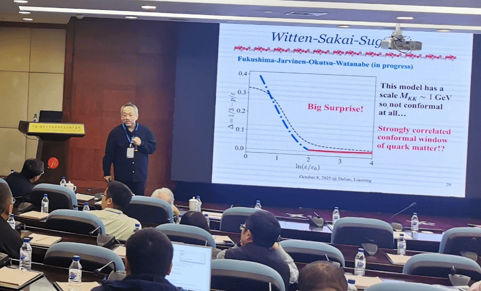 在随后的学术报告环节,华中师范大学许怒教授作题为 “Selected Results from RHIC BES-II” 的报告,系统介绍了RHIC重离子碰撞实验第二阶段(BES-II)的最新成果及其对探索QCD临界点的意义。德国海德堡大学Jan M. Pawlowski教授作报告 “QCD at High Density: Progress and Challenges”,综述了当前QCD高密度区理论研究的最新进展与存在的挑战。北京大学刘玉鑫教授以“QCD Phase Diagram in View of General Principle”为题系统地讨论了从第一性原理出发对QCD相图相结构的理解。东京大学Kenji Fukushima教授则以“Emergent conformality in dense QCD matter: some lessons from a holographic QCD model”为题从全息的视角考察了高密度区域QCD相图的结构。
