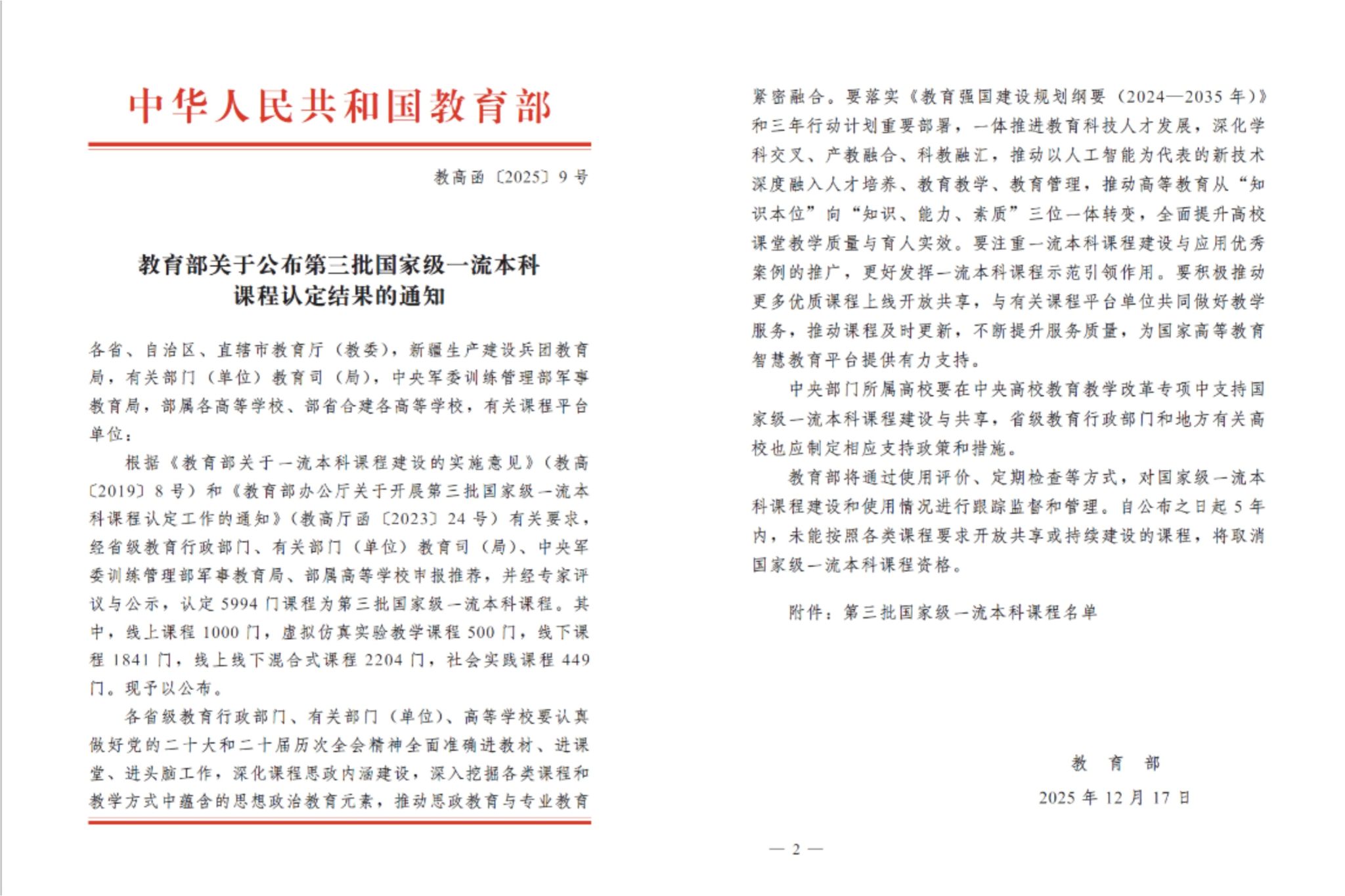 国家级一流本科课程建设是教育部贯彻落实新时代全国高等学校本科教育工作会议精神,全面振兴本科教育,提升人才培养质量的重要举措。学院实验课程入选,既是对相关课程团队长期教学积累与实践的充分肯定,也为学校进一步优化课程体系、示范带动全校课程整体质量提升注入强大动力。