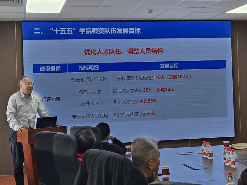 副院长杨德正就学院“十五五”师资队伍建设目标作专项说明。他强调要抓好目标和任务分解,加大海外人才引进力度,锚定国家重大战略需求,紧扣学校事业发展导向,力争在“十五五”期间实现人才队伍提升,人员结构优化。