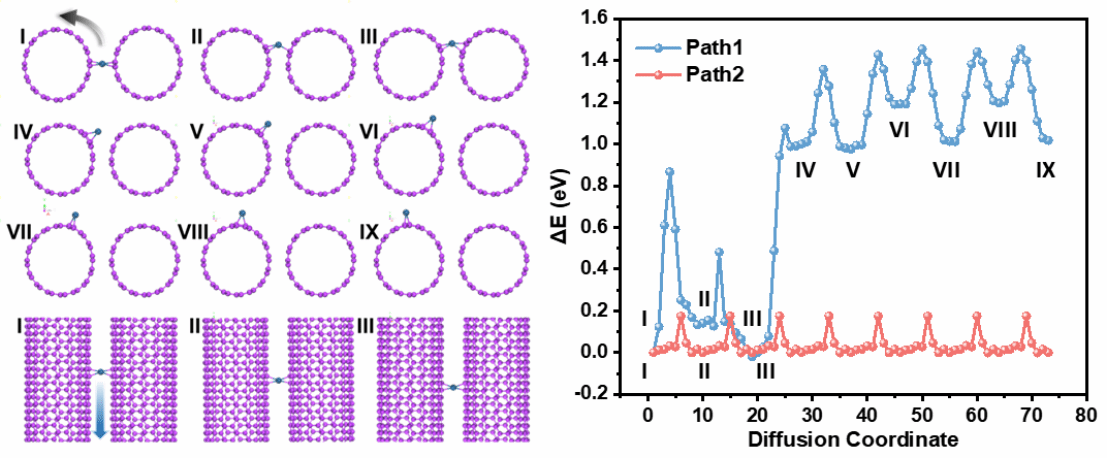 图3. Pt原子沿碳纳米管径向和轴向扩散的原子示意图和势垒