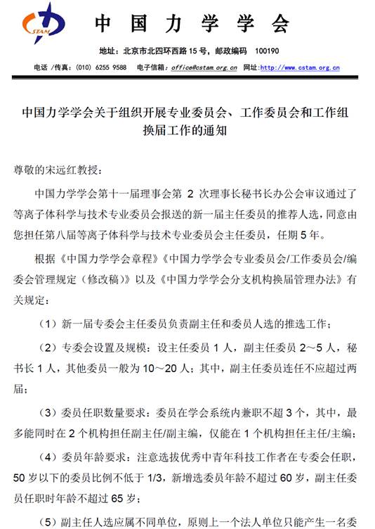 近期,我校物理学院宋远红教授当选为中国力学学会第十一届理事会理事,并通过中国力学学会第十一届理事会第二次理事长秘书长办公会审议,正式成为第八届等离子体科学与技术专业委员会主任委员,任期5年。