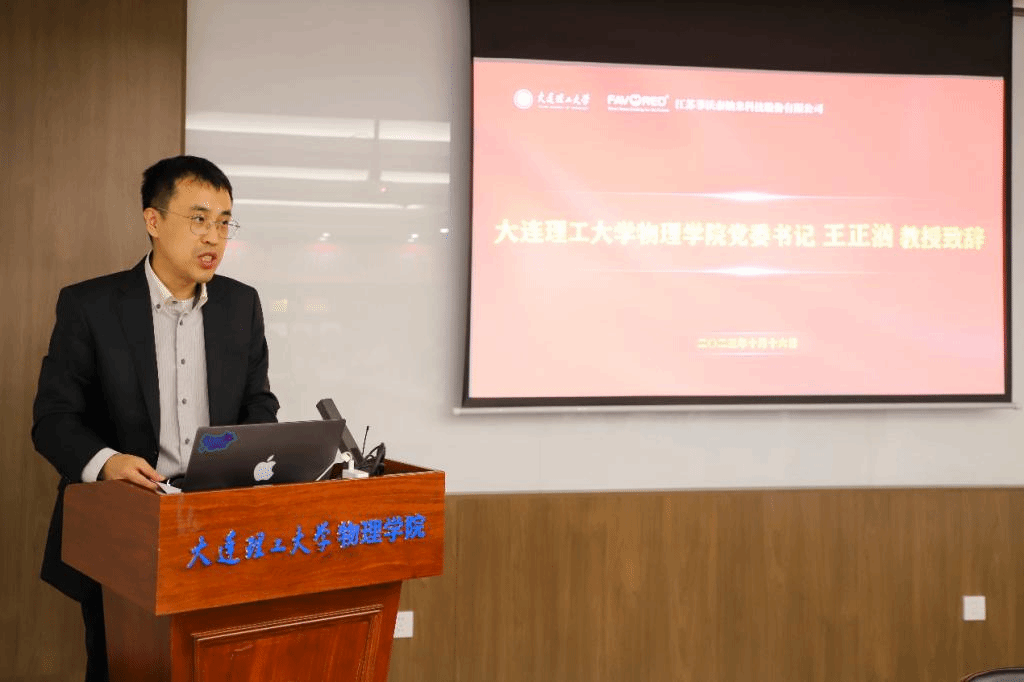 王正汹对物理学院的历史沿革和近几年承担的重大专项进行了简要介绍。王正汹表示,菲沃泰和我院王友年教授领衔的等离子体模拟与实验课题组开展联合攻关,并取得了喜人的阶段性成果。对于“菲沃泰奖学金”,学院定将科学统筹、善款善用。王正汹鼓励物理学子加强基础研究,追求真理,勇攀高峰,把研究成果应用在全面建设社会主义现代化国家的伟大事业中去。