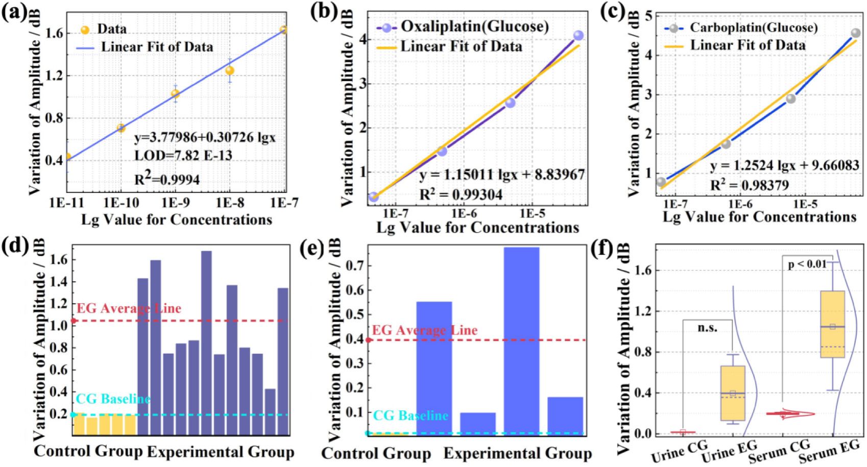 该平台的检测范围在10 pM至0.1 μM之间,检出限为782 fM,且覆盖临床有效浓度区间,对Pb2+、Mn2+、Cu2+、Ca2+等常见金属离子无交叉响应,检测结果有较高的可重复性,三次独立实验标准差小于5%,检测结果具备良好的可靠性。在临床样本中,对30例临床血清与尿液免标记样本进行检测,用药组与健康对照组信号差异显著 (P < 0.01)。另外,得益于DNA靶向识别探针的灵活可编程性,通过改变探针序列,可以将该检测方案拓展至miRNA、ctDNA、标志性蛋白等重要临床生物标志物的检测应用中。检测方案具备高度通用性与可编程性,为多癌种、多标志物联合监测提供技术基础。并通过深入开展临床横向免标记与纵向队列样本综合检测研究,采集结直肠癌与卵巢癌患者化疗前后血清样本,进行无标签、超痕量快检,揭示了铂药浓度与miRNA-21表达水平之间的潜在负相关关系,验证了平台临床适用性与生物标志物潜力。该工作结合学校医工交叉合作的契机,通过光纤智能感知技术团队和肿瘤临床医生团队多年合作,为精准化疗的动态监测与个体化剂量调整提供了标准化、集成化、智能化的技术方案,为后期AI整合数据以实现多组学辅助诊疗模型的搭建提供了有效的解决途径,具备潜在的临床转化前景。