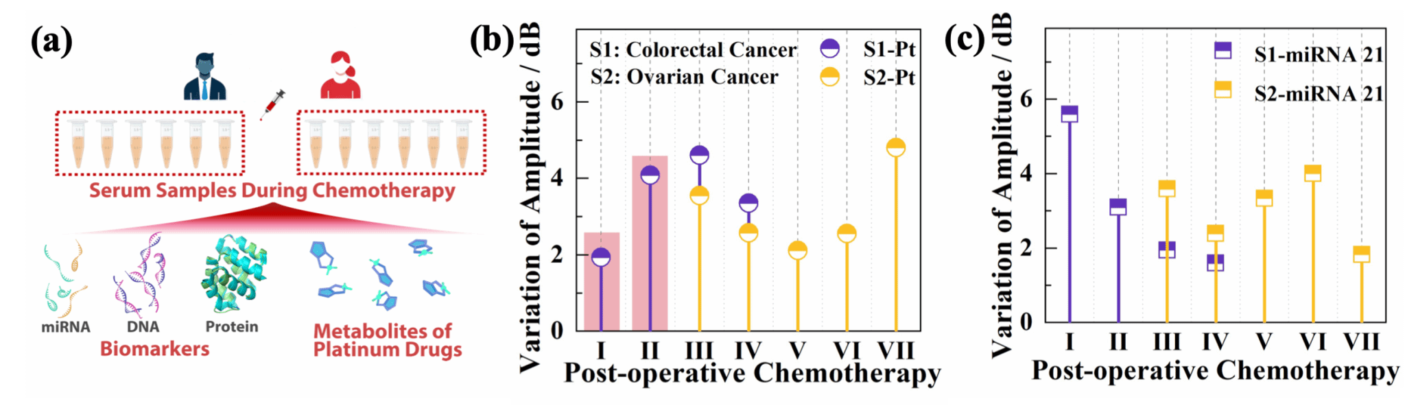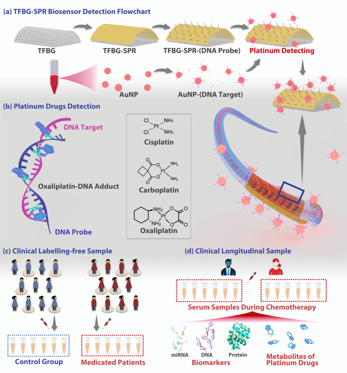 大连理工大学物理学院先进光学与光纤传感彭伟教授课题组与大连理工大学附属肿瘤医院(辽宁省肿瘤医院)检测科、神经外科、妇科展开深度合作,以倾斜光纤布拉格光栅表面等离子共振 (TFBG -SPR) 技术的光纤传感元件为核心,结合DNA靶向捕获探针,实现了临床铂类化疗物的高特异性、超痕量POCT检测,为化疗过程中铂药的药代动力学分析提供了有效方案;另外同步开展癌症标志性核酸序列miRNA-21的多组学分析,最终服务于精准化疗的、管理与个体化治疗决策提供动态数据,并首次通过POCT临床快检平台技术发现了铂药和miRNA在预后化疗周期的负相关性。该成果以“Plasmonic Fiber Optic Sensing Platform for Point-of-Care Pharmacokinetic Monitoring of Platinum Chemotherapeutics:  Toward Ultra-trace Multi-Omics Precision Chemotherapy Management”为题发表于ACS Sensors,第一作者为大连理工大学物理学院博士研究生段怡凡,通讯作者为大连理工大学物理学院张扬副教授、辽宁省肿瘤医院检测科主任郑阳医生以及结直肠科李永民医生。