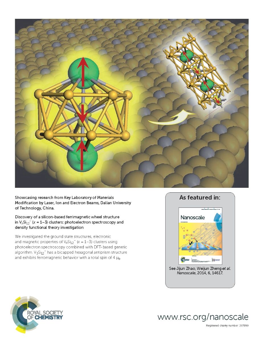 近日,赵纪军教授课题组博士生黄晓明等人与中科院化学所郑卫军研究员课题组合作,在团簇研究领域取得了重要进展,首次在掺杂硅基团簇中发现具有新奇原子结构和亚铁磁性的V3Si12-团簇。研究结果发表在纳米领域重要刊物Nanoscale(影响因子6.739)上,并被选为当期背封底(Inside Back Cover)论文,论文链接: