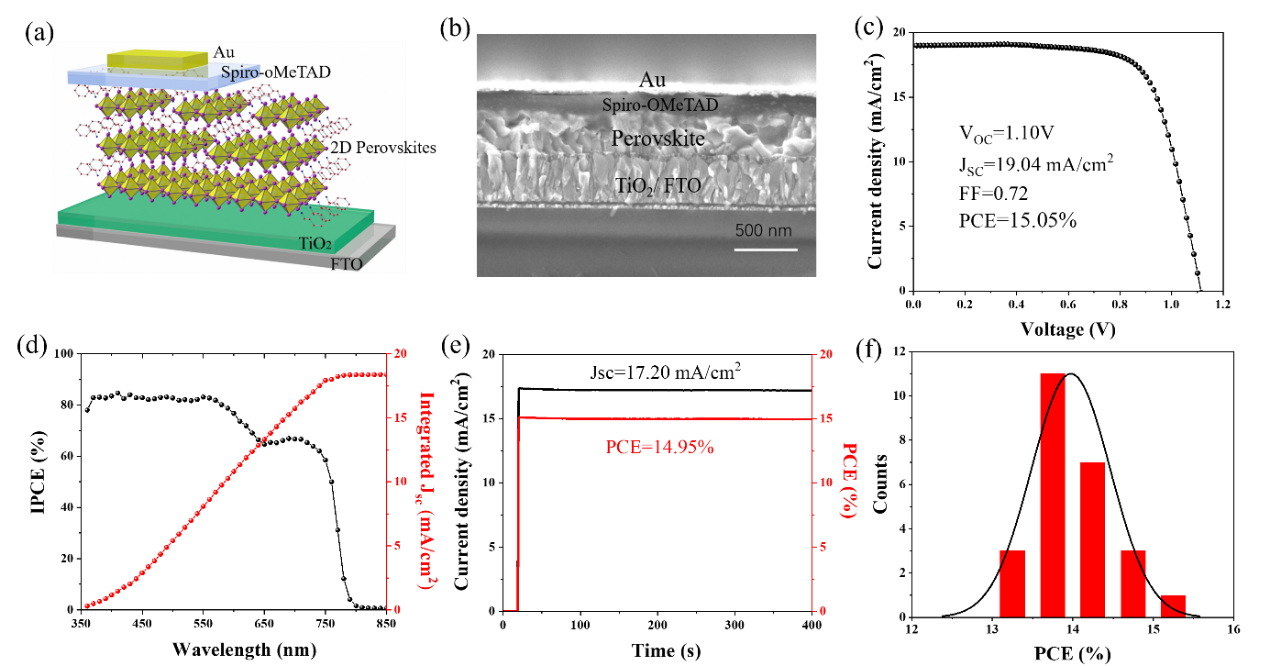 本研究中所制备的2D-RPPs结构为(CMA)2(MA)n-1PbnI3n + 1(MA为CH3NH3 +,CMA 为C6H11CH2NH3 +,n = 1,2,3 ......),采用环己甲胺(CMA)为间隔阳离子。与先前报道的RPP不同,这种新钙钛矿材料的沉积膜表现出反向量子阱(QW)分布的多个相:即小n值的相主要分布在薄膜表面而大n值相集中在薄膜底部。这种分布结构具有以下三个优点:(1)分布在表面具有更强抗湿性的小n值成分可作为屏障,保护脆弱的大n值成分免受水分子的侵蚀;(b)不同相之间组成了第二型能级排布,有利于自驱动电荷的传输;(c)独特的阶梯状量子阱分布拓宽了光子吸收范围,尤其增强了短波处的吸收。由于这些特性,基于环己甲胺的正式平面二维钙钛矿太阳能电池取得了1.10 V的高开路电压,达到了15.05%的能量转换效率。迄今为止,这一结果是已报道的具有正式结构的甲胺系(MA)二维钙钛矿太阳能电池中的最高效率。