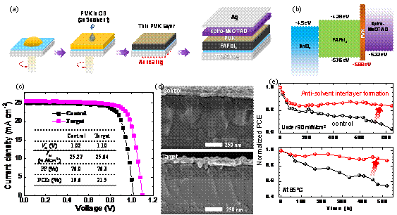 成果简介:这项技术的发展重点是实现高效、稳定的PSCs并探清其物理机制。目前,绝大多数高效稳定的PSCs都是基于多阳离子混合阴离子的组合物,其中甲基铵的热不稳定性和混合卤化物组分的相分离倾向严重限制了PSCs的长期稳定性。近日,博士后王敏焕在该领域取得突破性进展。首次提出了原位反溶剂界面PVK钝化技术,实现了基于完全无铯、无甲基铵和无溴钙钛矿组分(FAPbI3)的太阳电池,稳态效率达19.36%,且光热稳定性大幅提升。该成果将为高性能钙钛矿光电器件的研制和实用化提供理论依据和实验技术指导。以“Stable and Efficient Methylammonium, Cesium, and Bromide-free Perovskite Solar Cells by in-situ interlayer formation”为题,发表在《Advanced Functional Materials》上。论文第一作者为大连理工大学物理学院博士后王敏焕,大连理工大学边继明教授、韩国成均馆大学Jin-Wook Lee教授和美国加州大学洛杉矶分校Yang Yang教授为共同通讯作者。该成果得到国家自然科学基金等项目资助。王敏焕于2020年6月博士毕业于大连理工大学微电子学院,现为边继明教授课题组博士后。博士期间荣获校学术之星、研究生国家奖学金(3次)、辽宁省优秀毕业生等多项奖励,在Advanced Materials, Nano Energy, ACS Applied Materials & Interfaces等材料能源领域国际期刊发表论文近20篇。一直从事钙钛矿光电材料与器件研究,并先后在本领域国际顶级科学家美国加州大学洛杉矶分校YangYang课题组和韩国成均馆大学N.G. Park课题组联合培养。