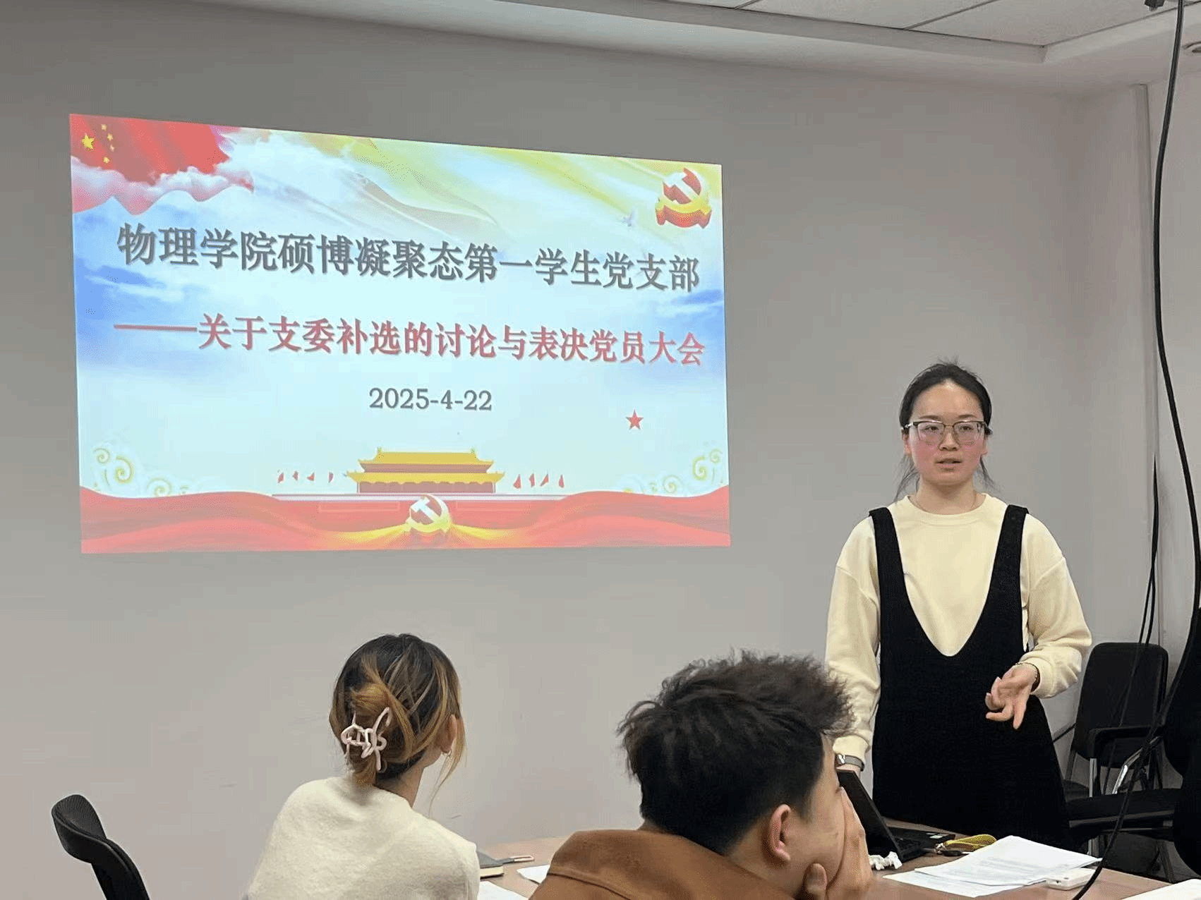 为贯彻落实中央八项规定精神,强化党员政治素养、夯实党组织建设,2025年4月22日,物理学院硕博凝聚态第一学生党支部在科技园C座510会议室召开党员大会暨“深入贯彻中央八项规定精神学习教育”主题党日活动。本次会议内容还包括了“学习2025年全国两会精神”主题党课和关于支委补选的讨论与表决。会议由党支部书记李希娜同志主持,支部全体党员参会。