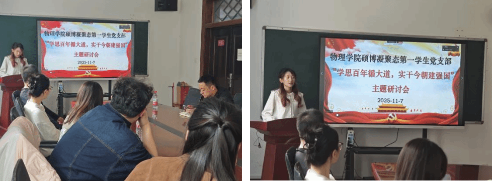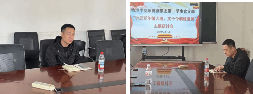 为深入推进党员基本培训工作,引导全体党员深刻领悟“两个确立”的决定性意义,2025年11月7日上午10:00,物理学院硕博凝聚态第一学生党支部在物理学院425会议室开展了“学习党史赋能,共赴民族复兴”主题研讨会。会议由党支部书记郑祉溦同志主持,并邀请物理学院党委副书记兼副院长周福良老师莅临指导,党支部全体党员参会。