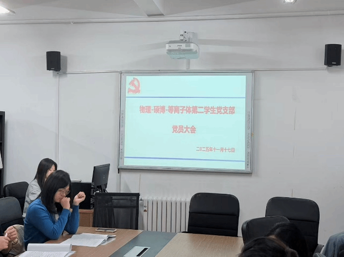 为深入学习贯彻党的二十届四中全会精神,加强党员队伍建设,为党支部注入新生力量,物理学院硕博等离子体第二学生党支部于2025年11月17日下午4:30在物理学院422会议室召开党员大会,会议集中学习“十五五”规划纲要精神,并严格按照组织程序,讨论并表决通过了接收王磊、韩晓雪两名同志为中共预备党员的事宜。会议由党支部书记王瑛琪同志主持,党支部全体党员参加。