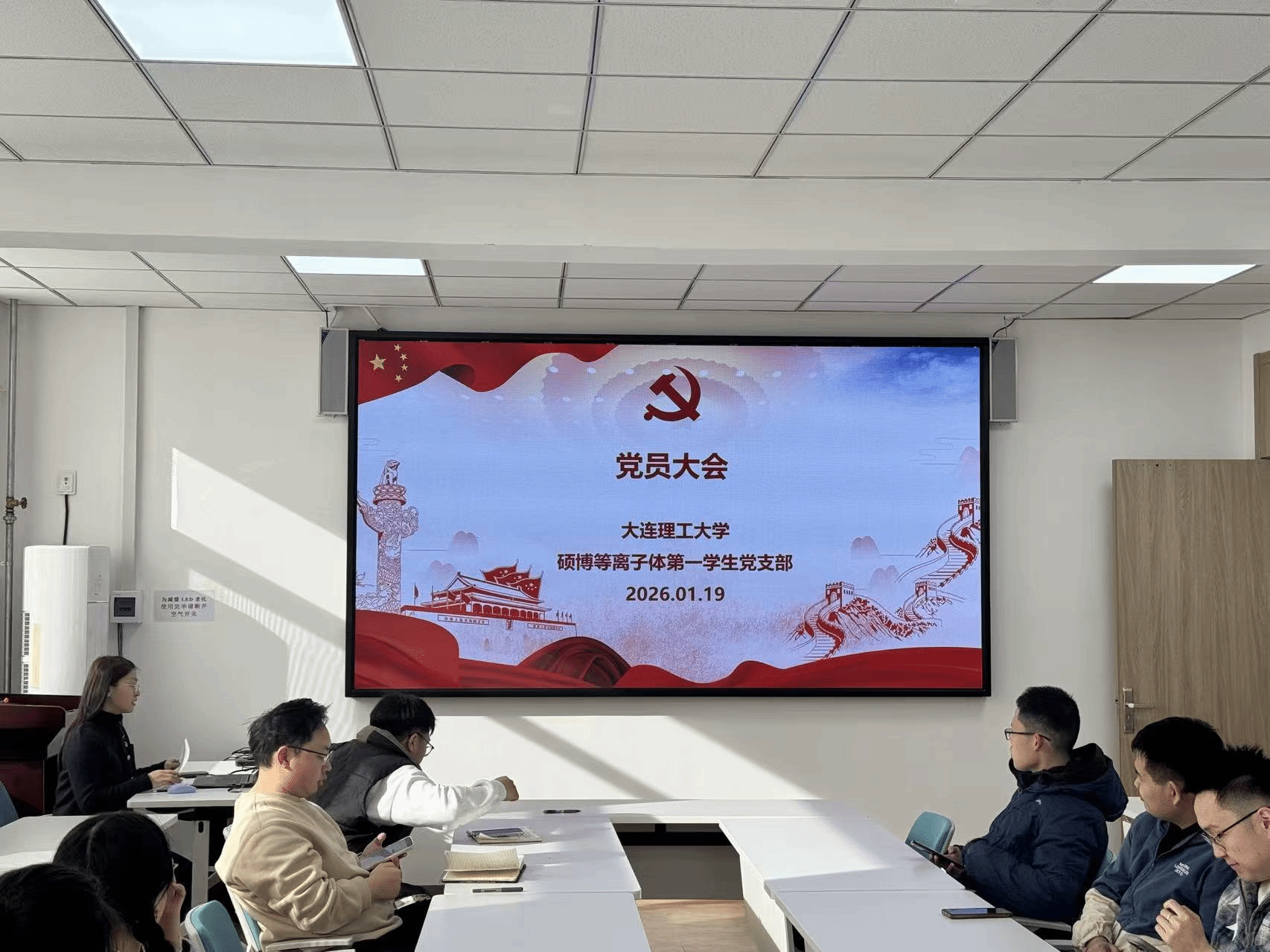 为深入学习贯彻习近平新时代中国特色社会主义思想,切实把思想和行动统一到党中央决策部署上来,2026年1月19日,物理学院硕博等离子体第一学生党支部在三束实验室4号楼413会议室召开党员大会。党支部书记李淑琪主持会议并领学,全体党员参加会议。