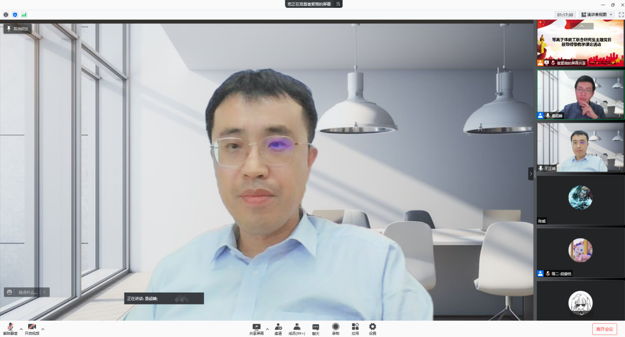 为响应学院党委关于加强深入学习党的十九届六中全会精神要求,发挥基层党支部宣传群众职能。同时为及时了解并解决疫情期间研究生遇到问题,2021年11月26日,物理学院等离子体物理教工和硕博学生党支部通过腾讯会议开展了以学习党的十九届六中全会精神和解决疫情“封校”期间问题的联合主题党日活动。等离子体物理教工党支部书记桑超峰教授讲解了党的十九届六中全会的主要内容并和相关精神,三名等离子体学生党支部书记对疫情期间研究生心理、科研等方面存在的问题进行反馈,物理学院党委书记王正汹教授、副院长高飞教授等对疫情封校后同学们反映的所遇到的问题予以解答并提出应对方法。活动受到老师同学积极响应,共有187人参会,其中老师25人,学生162人。