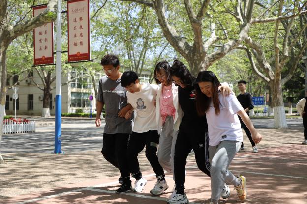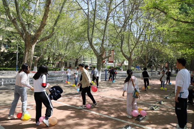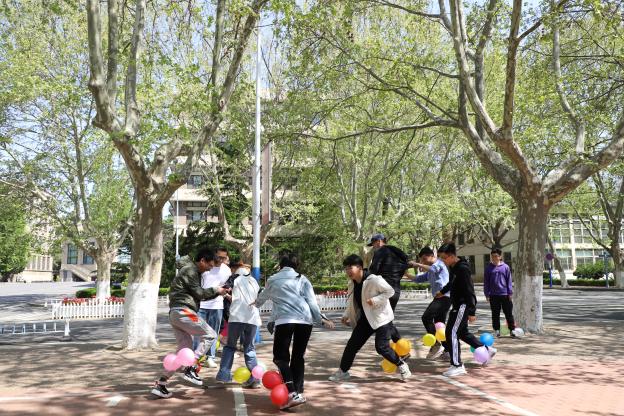 每位参数队员的腿上各系上三个气球,在五分钟之内互相踩对面小组的气球。剩余气球数量多的队伍获胜。同学们默契配合,场下观众加油助威,现场其乐融融。