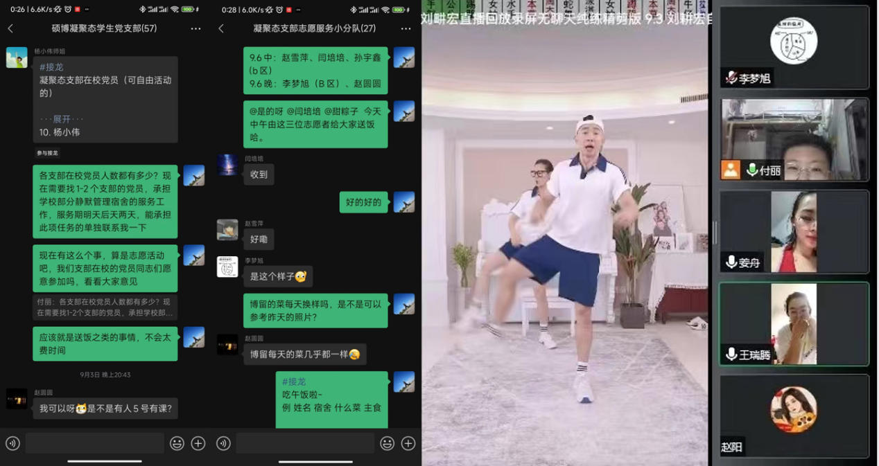 9月1日下午,有课题组同学被列为第二、第三密接。按照防控要求,密接同学需要集中隔离、宿舍静默。得知情况后,硕博凝聚态学生党支部联合团支部迅速排查在校学生状态,掌握每位同学情况。根据具体情况,支部快速组建起一支学生党员志愿服务小分队,为十余名在隔离、静默的同学提供生活保障。支部在校党员主动报名,按时为隔离、静默的同学们送餐,采购必要生活物资。此外,支部还组织了“云健身”、水果集中采购发放等活动来缓解同学们长时间不能出寝室的焦虑情绪,积极鼓励大家增强主人翁意识,共克疫情难关。