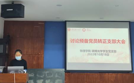 2022年10月18日下午18:30,物理学院硕博光学学生党支部在物理楼322会议室召开了预备党员转正支部大会并开展理论学习,会议内容包括对高楠等四位预备党员的转正问题进行讨论以及集中学习《习近平谈治国理政》第四卷。支部全体在校党员参加,尚未返校的党员同志通过腾讯会议线上参加,会议由党支部书记陈中华主持。