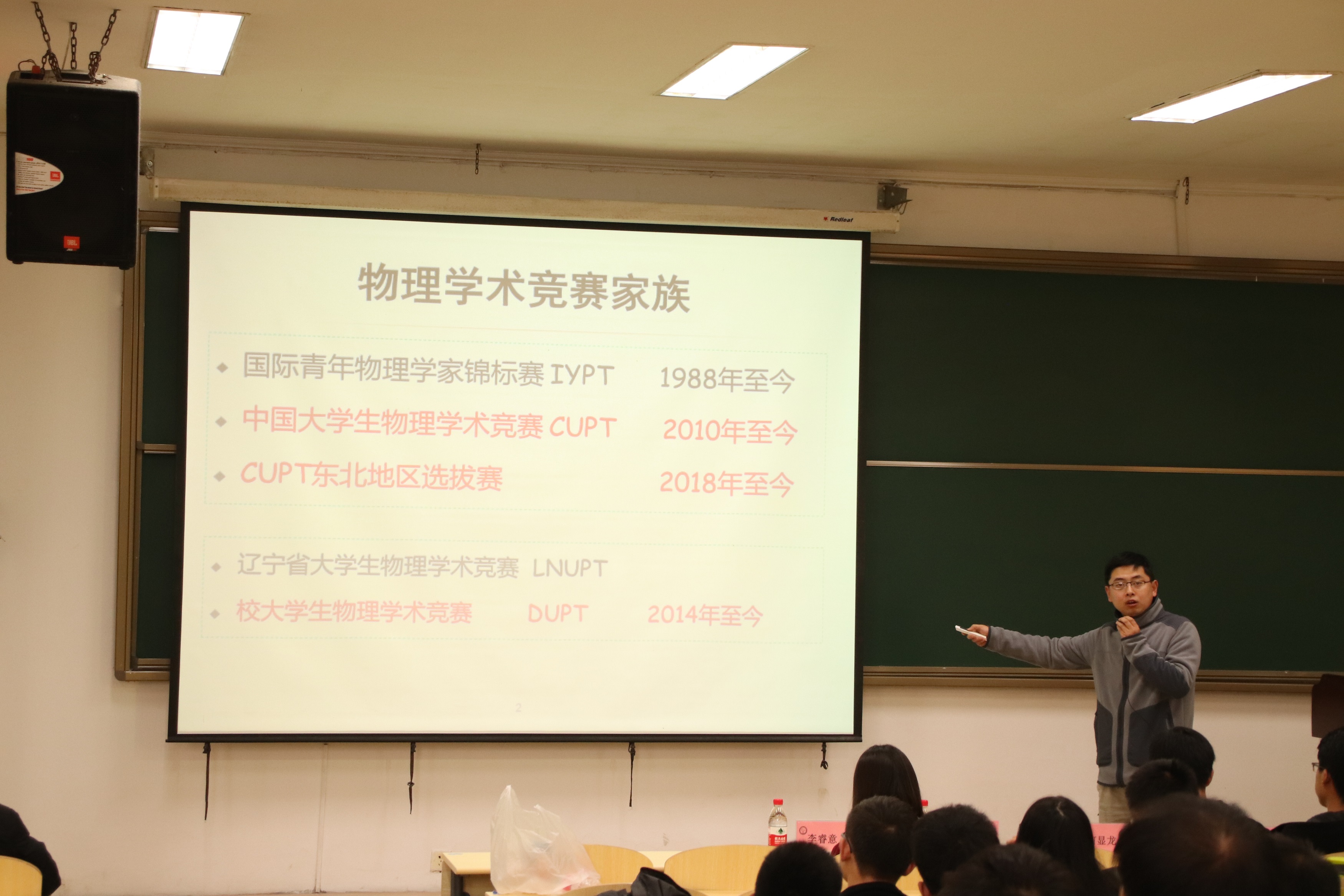 宣讲会之初,白洪亮老师率先上台,针对于物理学术竞赛的背景进行详细的介绍。在发言中,他表明CUPT是以学术讨论、团队对抗为形式的物理学竞赛,让选手们对竞赛有一个更深刻的认识。此外,他还介绍相关的各个物理学术竞赛、相应的网络平台、学校的投入、物理学术竞赛的发展历程以及历年取得的成绩。尤其是提及去年第九届中国大学生物理学术竞赛大工代表队取得特等奖,提及他们的付出与努力时,白洪亮老师不禁热泪盈眶。接着,滕永杰老师向同学们讲解关于怎样完成竞赛题目。他认为同学们应该通过理解题意,实验先行,理论推导等步骤完成对竞赛题目进行解答,同时也强调一些比赛细节及作品原创的重要性。