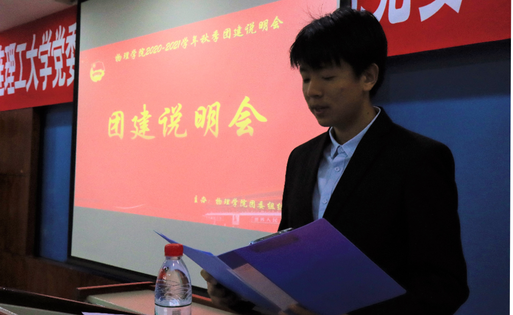 2020年10月18日晚6点,为更好地加强基层团组织建设,物理学院团委组织部在物理学院系楼325教室举办团建说明会。本次会议的主持人为物理学院团委组织部副部长李沐旭。本次团建说明会分两部分,分别是讲解团建手册的检查规则、介绍团建手册的基本写法。