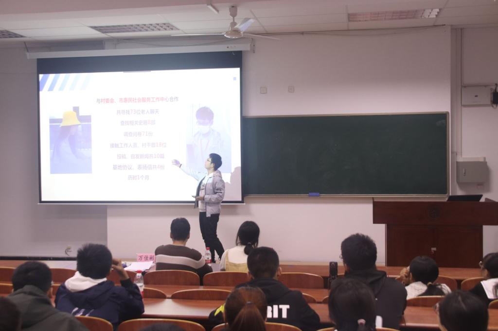 接下来是优秀社会实践团队代表分享经验环节,由万佳彬结合自己暑假期间的社会实践经验向同学们讲解社会实践的主要流程以及一些注意事项。万佳彬向同学们强调实践过程中的反馈是必不可少的。实践过程中的反馈既可以拿实践前后自己或者他人的变化为中心做展开总结,还可以是自己记录下的所见所闻,所感所想。最后,万佳彬向大家展示了实践活动总结的模板,并提醒大家在实践活动结束后不要忘记对自己的实践活动进行宣传。
