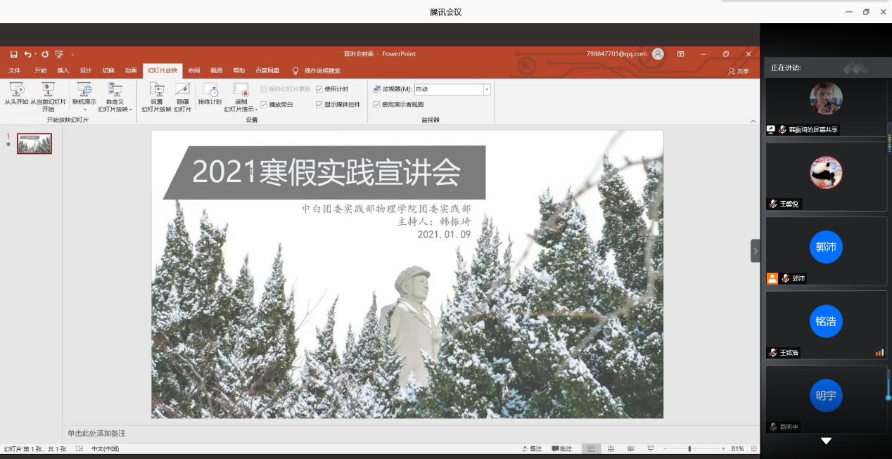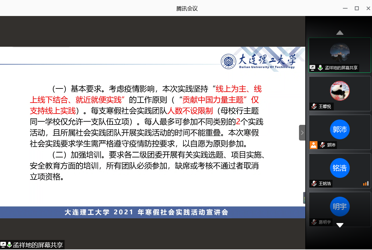 为培养大学生的实践能力,提高实践素养,同时遵循当下疫情防护要求。在2020年1月9日晚19:00,大连理工大学物理学院和中白学院团委实践部联合举办寒假社会实践线上宣讲会,为今年的寒假社会实践工作顺利展开而做铺垫。会议由中白学院实践部负责人孟祥地和物理学院实践部工作人员郭沛对此次寒假社会实践进行讲解。