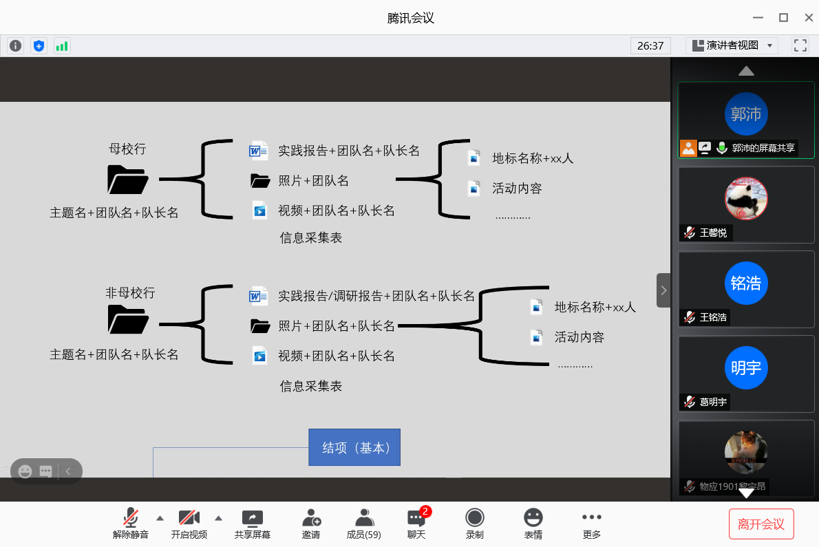 会议开始,孟祥地同学就向大家依次介绍9个寒假社会实践主题类别,详细讲述每个主题实践的相应内容和精神内涵。在疫情的特殊背景下,本次寒假社会实践还新增开设“共抗疫情贡献青春力量”的主题实践活动,挖掘身边抗“疫”先进人物的事迹和精神,创造抗击疫情的文化作品,赞颂抗“疫”英雄、传播抗“疫”故事。其次,孟祥地同学还讲解寒假社会实践的立项要求以及材料准备,并特地说明寒假实践的注意事项,让同学们能更好地开展寒假社会实践。