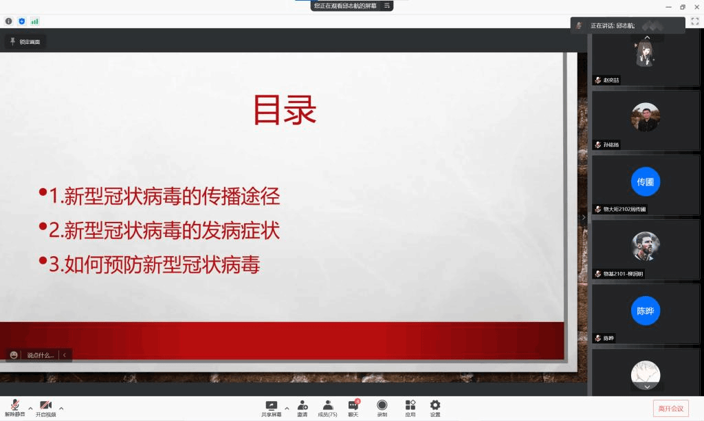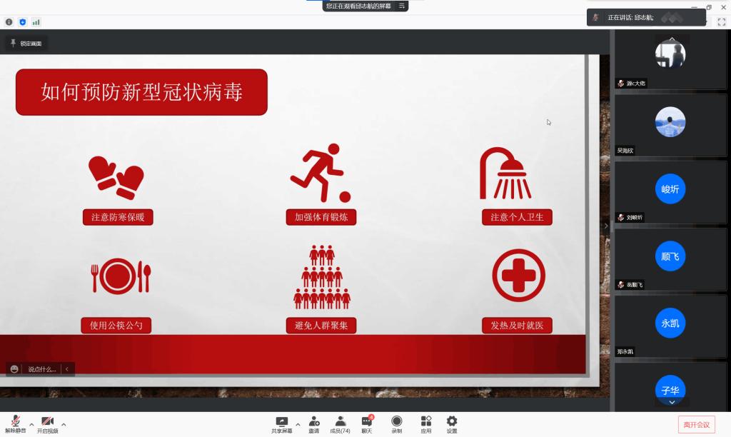 寒冬初至,疫情再次袭来,为学习防疫常识,弘扬抗疫精神,我们相约线上,召开了此次会议。本次宣讲会由来自理论宣传中心的孟令文同学主持,由邱志航同学和刘泽璇同学分别进行了宣讲,参加本次宣讲的还有物理学院大一全体同学。