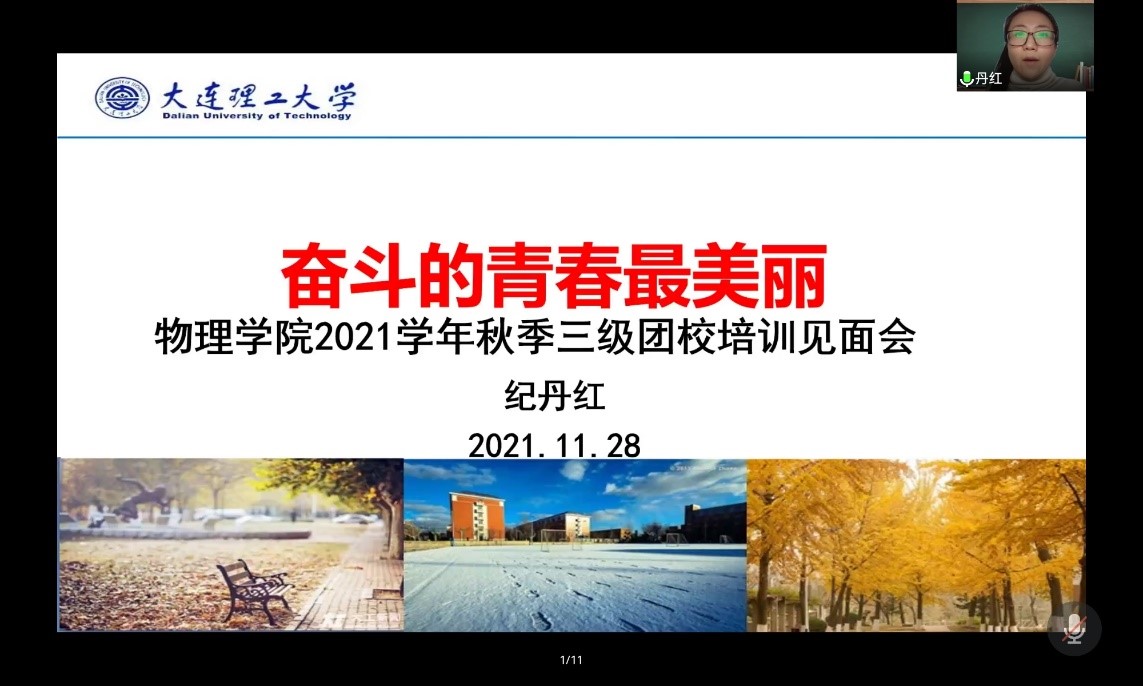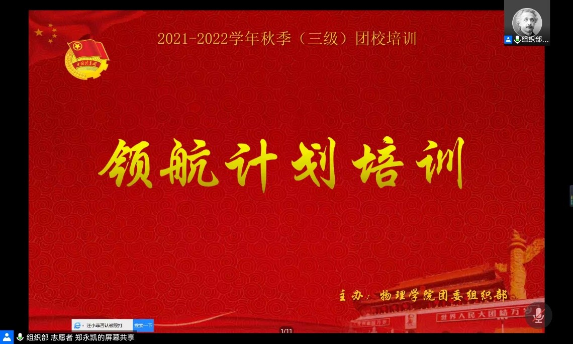 2021年11月28日晚,物理学院三级团校培训采用线上形式顺利召开。参加本次会议的有物理学院团委书记、20级队辅导员纪丹红老师,物理学院团委副书记、21级队辅导员陈万年老师,校学生会熊天成同学,校团委朴舒梵同学、汪不凡同学,理论学习中心的吴海欣同学及物理学院团学所有成员。