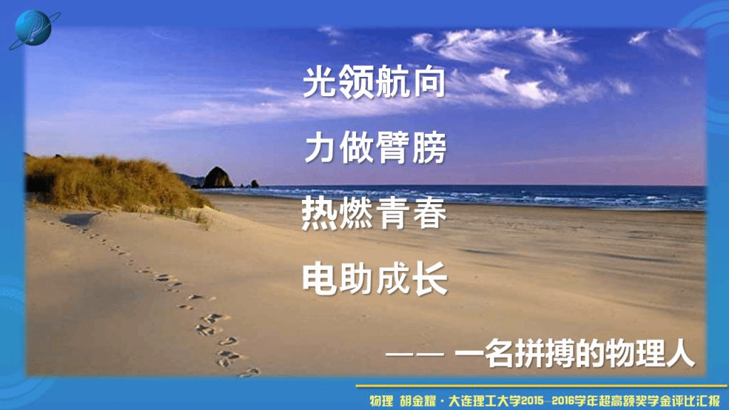 我是物理学院2013级光电信息科学与工程专业的胡金耀。很荣幸参与高额奖学金答辩。我汇报的主题是“力热光电”筑基,拼搏奉献在大工。今天,我以一名物理人的身份,汇报我的大学故事。